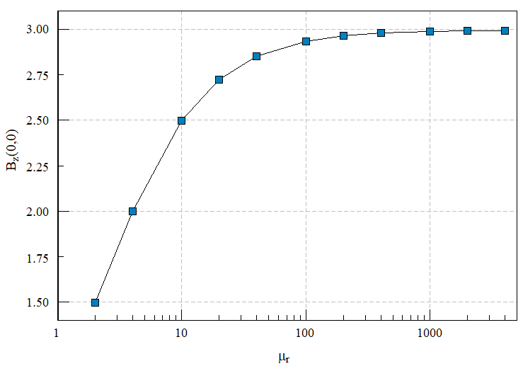 The calculation was first performed with MuR = 1.0 and an arbitrary value of boundary stream function to determine a normalization factor to achieve a field of 1.0 mT. The resulting value of boundary stream function was used in subsequent calculations. The graph of Bz(0,0) versus MuR is included in the download file and shown below. A calculation was also performed to find the fields around the sphere in a high-frequency RF magnetic field. In this case, MuR was set to a value much less than unity so that the sphere acted as an ideal field excluder.