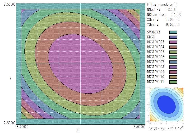To assign the intervals, a useful technique is to make a dummy run with a single interval and then to check the analysis of limits in the Mesh listing file (MLS). The function presents a challenge because it is diverges numerically at the origin where several contour lines converge. Although the mesh has fine resolution near this point, the fitting process is sporadic when the contour spacing is less than the element size. We have added a circular electrode definition after the Image section to show how a practical solution might procedure. The second illustration (Function02) demonstrates that the method is able to model complex variations. The final example (Function03) show how to map the data image to a section of the mesh area with sharp boundaries.