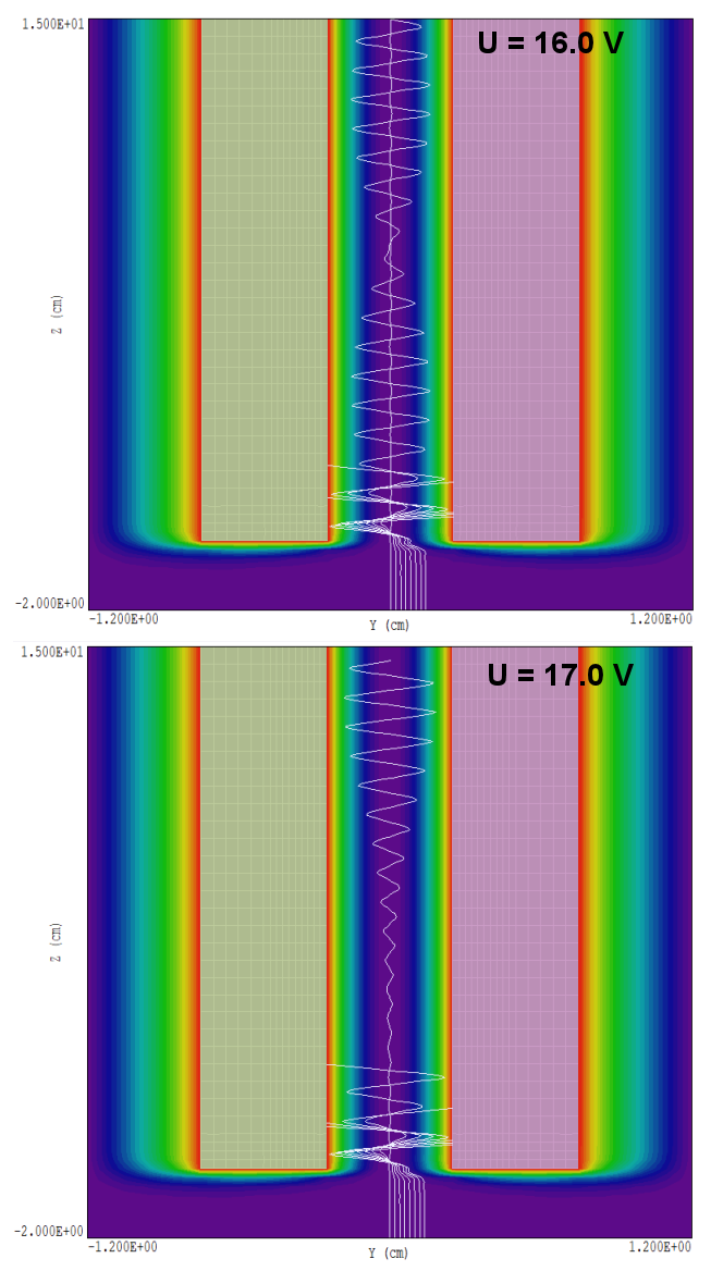 Quadrupole mass spectrometers have a variety of applications such as residual gas analysis. This example shows how to set up a 3D simulation of a quadrupole with bore radius 2.5 mm and length 100.0 mm. The theory of operation is reviewed in this tutorial: Modeling quadrupole mass analyzers. Numerical calculations like this one can deal with several real-world issues that are not addressed in the analytic theory, such as acceptance of incident ions with spreads in position, direction and energy. The example illustrates adjustment of the resolution and differentiation between isotopes.